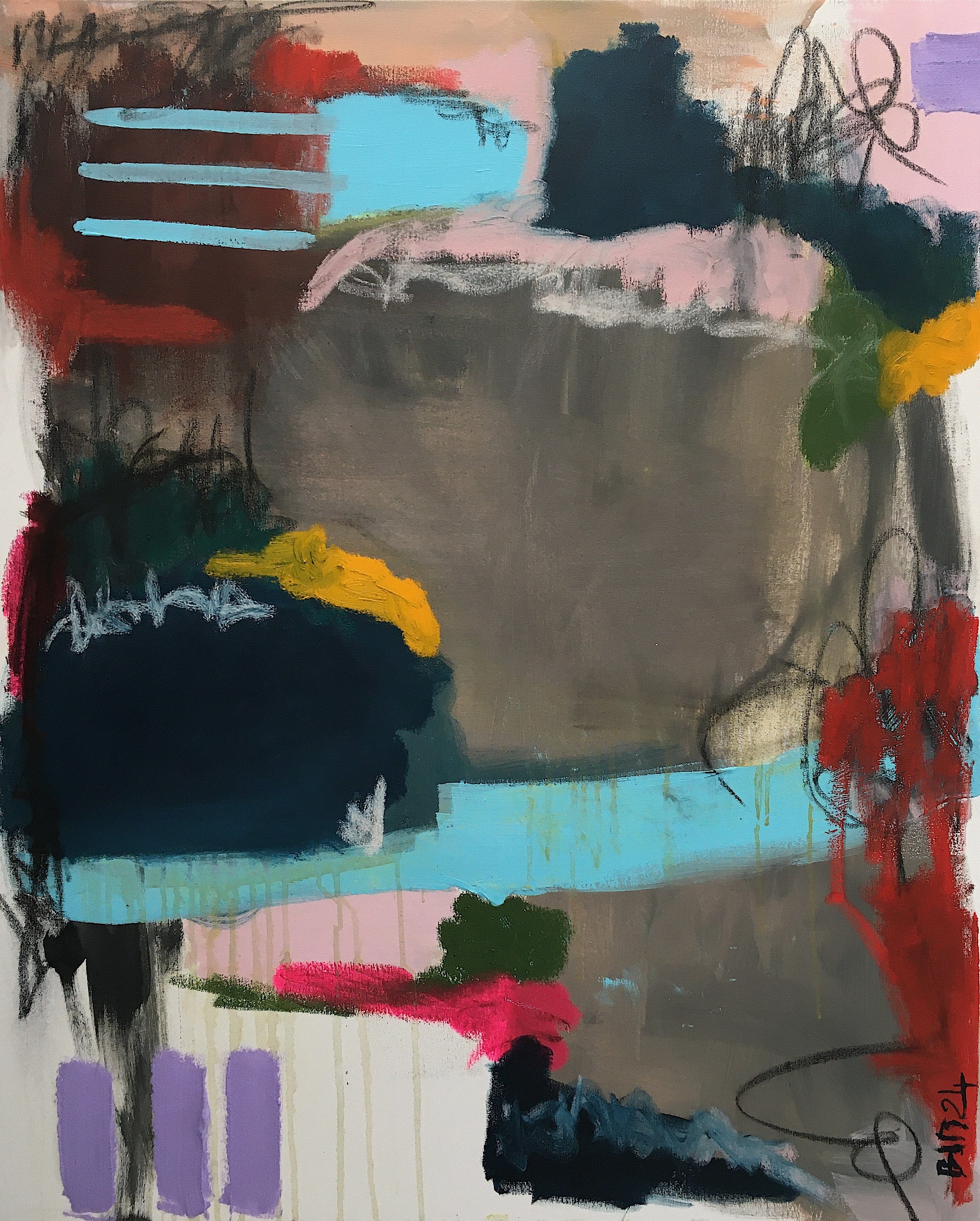 Acrylic, oil pastel, charcoal on canvas Include a decorative frame in white wood