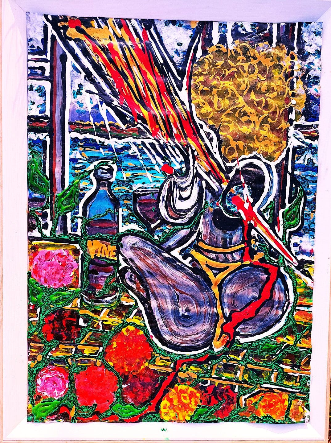 “Schlossing” – Water painting without water, created on a recycled laminated building sheet, strengthened and waterproofed for permanence. This technique involves pouring, finger-painting, and using gravity to guide thick liquid poster paints. Layers are sun-baked for texture and contrast, then sealed with multiple coats of automotive clear acrylic lacquer to ensure longevity. The process results in a multi-layered vision — in this case, ten separate paintings transcending into one final expression.