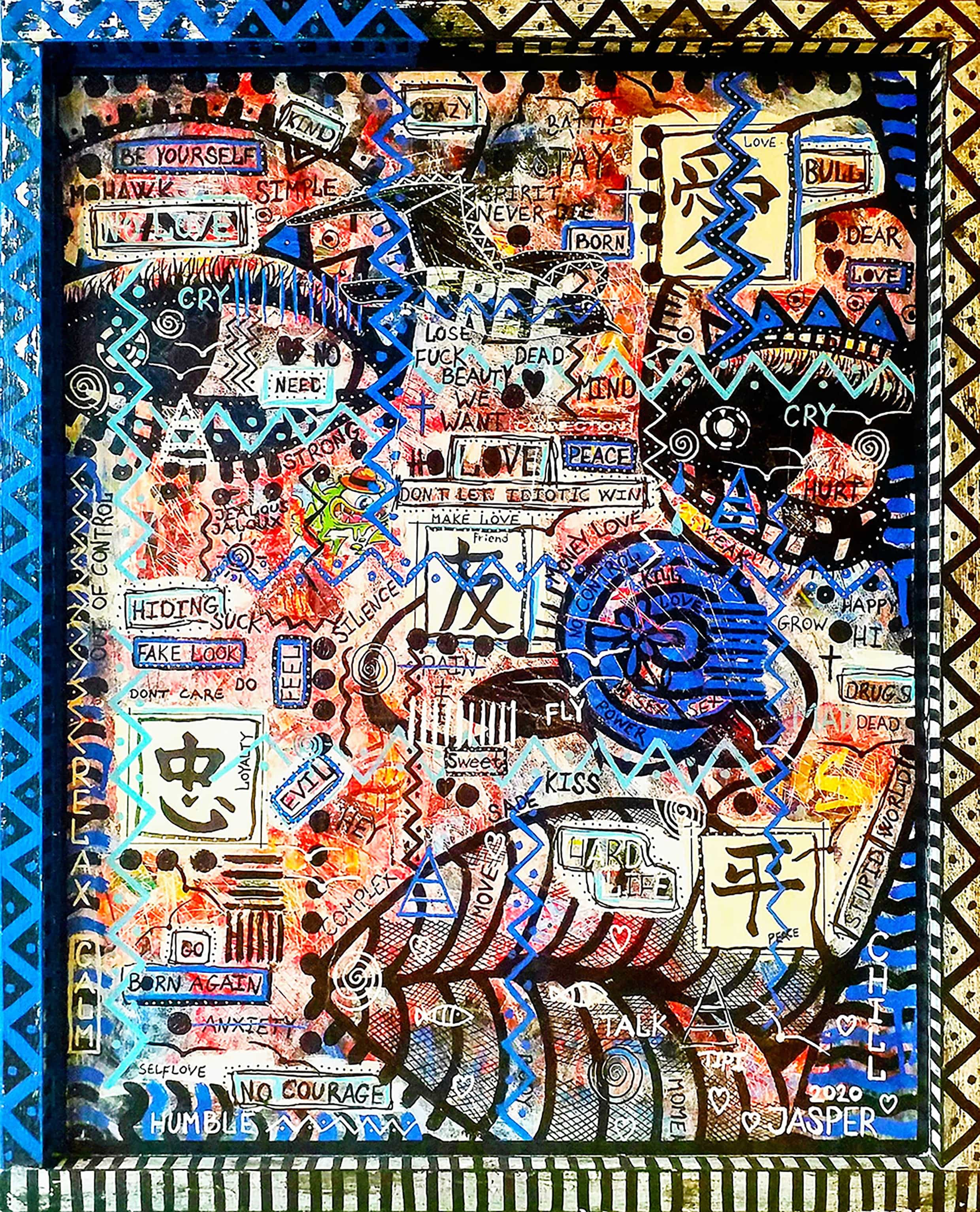 As a cute child, I kissed girls. My father didn't like it. He treated me harshly in public, and as a cute child, I did not comprehend it; it caused me profound distress. I was left alone in my room; none gave me love or support. It rooted my social anxiety toward humans, especially women, both when with them and when I saw them, which made me quiet and reticent. My father was unloving; this was his desire. The artwork is a testament to my frustrations with this inappropriate treatment by such an idiotic human who strangely disliked me and did not want me well or on this earth. They are power-hungry fools. I must be like them and live like them no matter what. They want me to abide by their laws and rules. They want me to work harder. If I do not do as they say, they become evil, and something unpleasant will happen. Therefore, I must avoid such humans to prevent further trauma. It is appropriate for me, as a cute man, to associate with cute individuals who demonstrate love so that I will feel happy. With these humans, I am free to be myself and to experience intimacy with women, which brings me happiness. Frustration, lack of love, and the demand for perfection are the keywords. Therefore, by remaining unseen, a tribal visage emerges behind. I perceive humans as evil. Tribal patterns and flying birds in front symbolize a life of freedom, simplicity, and calmness for me. Hearts and cute fish symbols suggest that the path to happiness lies in being with cute humans who are loving. The reason for the crosses is that I could just as well be dead without being intimate with women. The painting stands against evil but for what is loving—to be free and with women, which I have wanted since childhood, to be fulfilled.